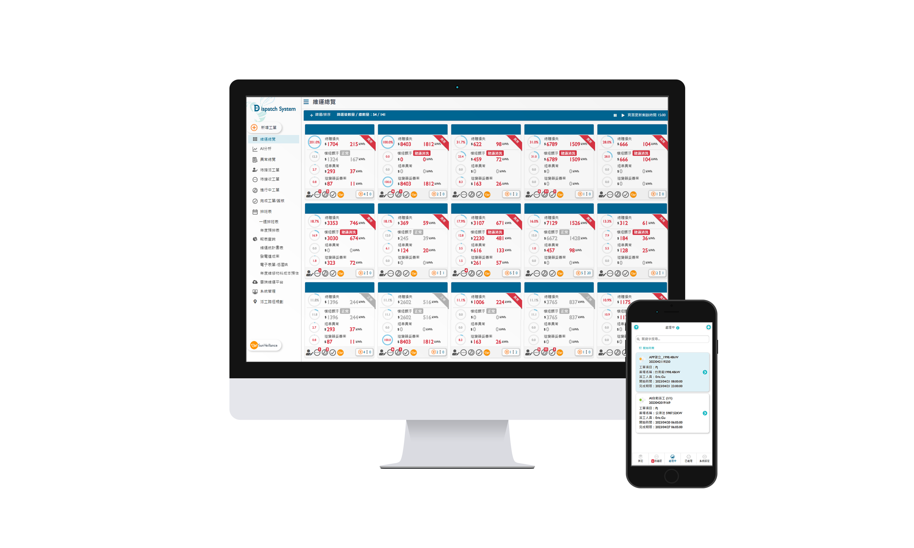 佰富彩太陽能智能運維管理系統包括雲端監控工具、AI分析與智慧自動派工及運維APP,實現電廠自主管理。